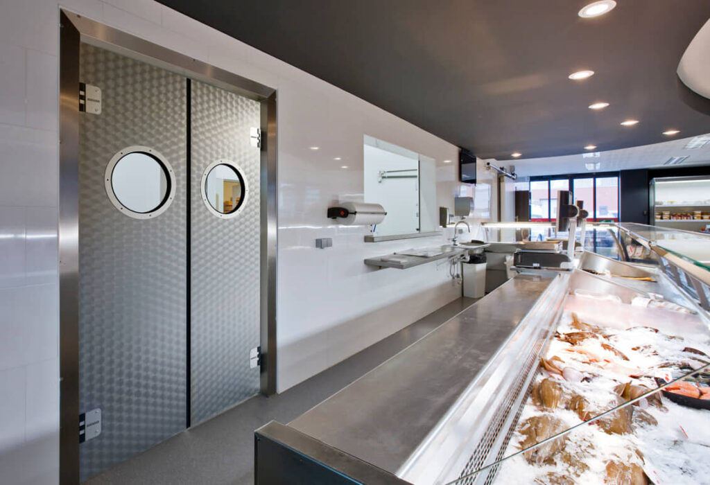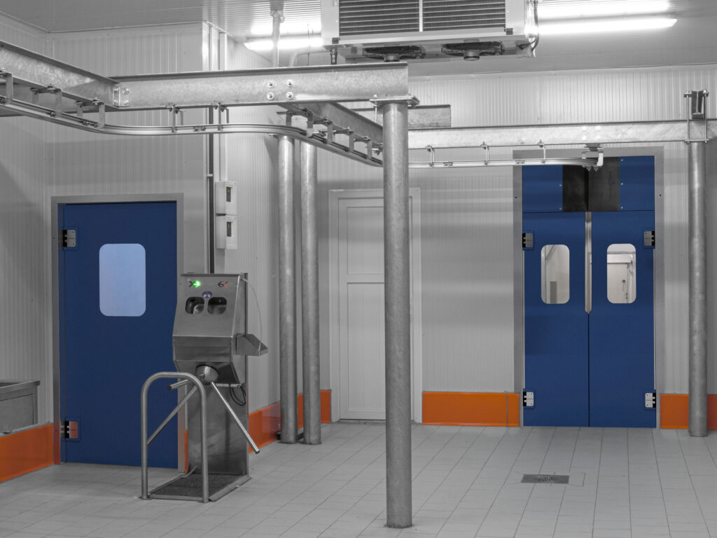 Yüksek hijyen standartlarına sahiptir, gıdaya uygundur, soğuk ve su geçirmez (PE, paslanmaz çelik ve HPL çarpma kapılar)