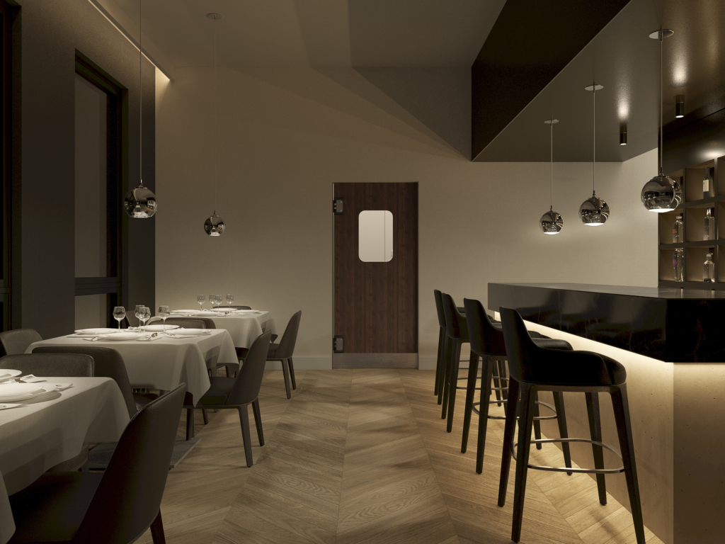 Ahşap desenli HPL kompakt panelden veya ahşaptan üretilen çarpma kapılar, özellikle restoran, otel ve mağazalara zarif bir görünüm katar.